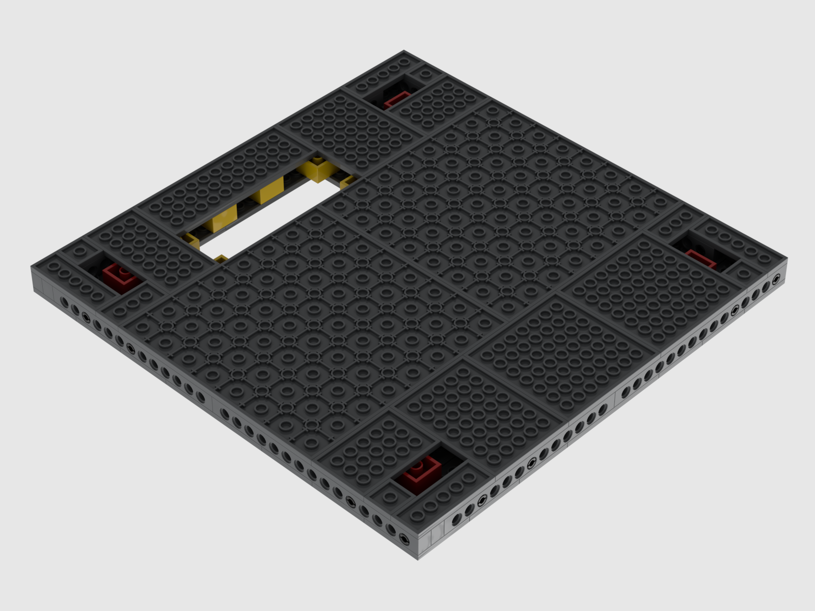 Die obere Lage kann man auch weitgehend mit 8×8 Plates statt 4×4 Plates bauen. In diesem Fall können in der mittleren Lage die 2×2 Bricks in rot entfallen.